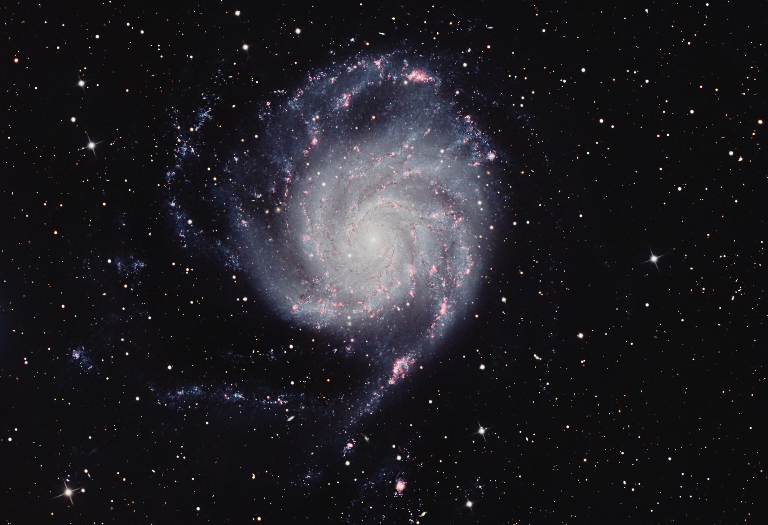 M101’s numerous H-II regions can be seen glowing with the red light of the H-α spectral line at 656.3 nm. The neutral hydrogen has been ionized by radiation from nearby hot young blue stars in the spiral arms.