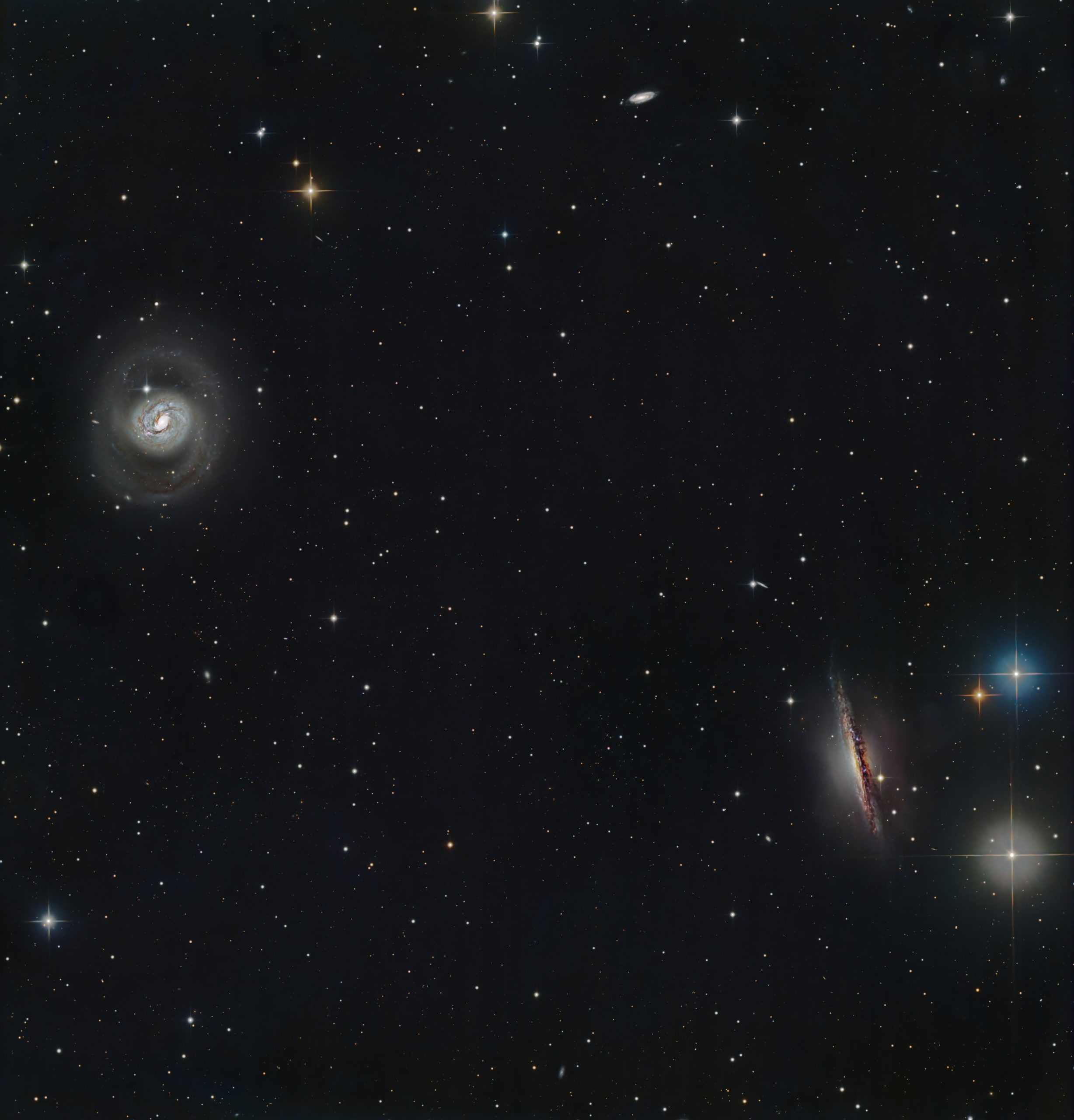 There are a few other small distant galaxies visible: to upper left of NGC1055 is PGC 1164535 at mag 16.56, 310 million ly away; and at bottom centre is PGC 135658, another spiral at mag 17.26, 370 million ly distant.