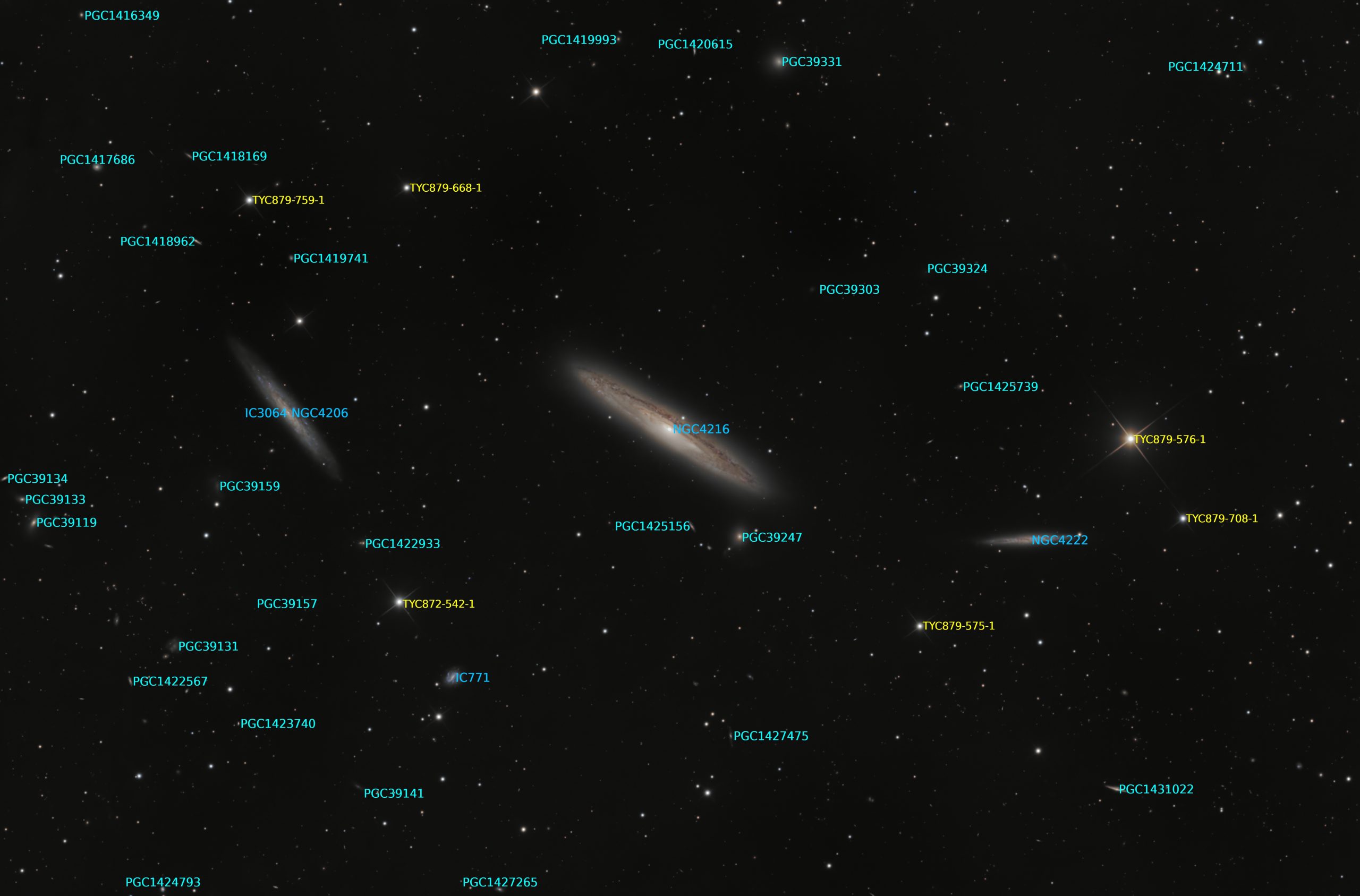 NGC4216 is a spiral some 8 arc-minutes long, total magnitude 10.3 but its surface brightness is rather lower at 13.1. It is about 55 million light years (mly) distant.