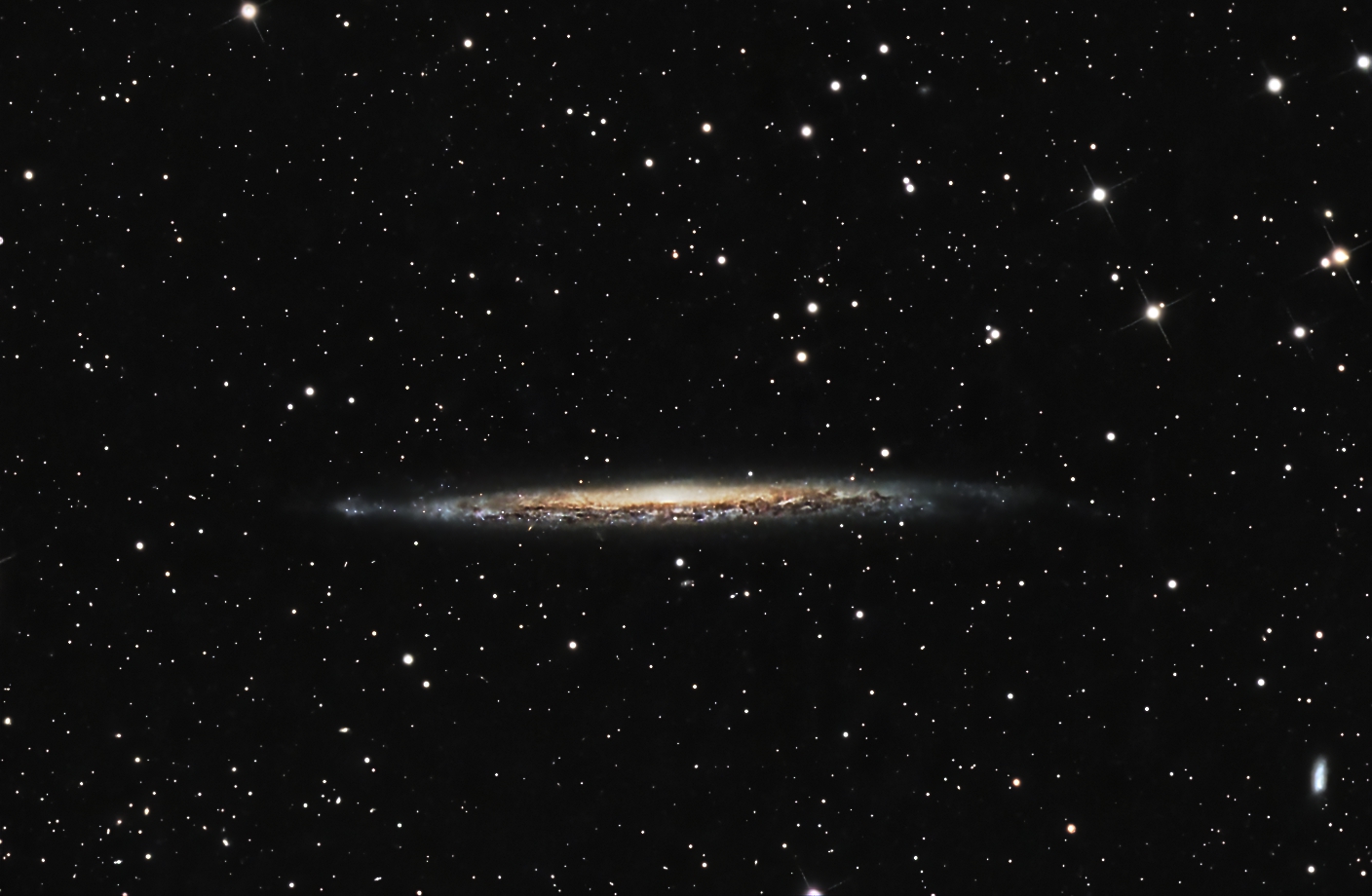 At magnitude 11.1, it is about 50 million light years away and is only 12 arcminutes long. It presents a similar appearance to the more famous NGC 4565 (see here) but is less spectacular. It is however unusual in that it seems to be comprised of mostly dwarf stars and this may be linked to its low metallicity (a measure of elements heavier than hydrogen and helium, that are synthesized in stars), since dwarf stars do not produce heavier elements as quickly as giant stars.